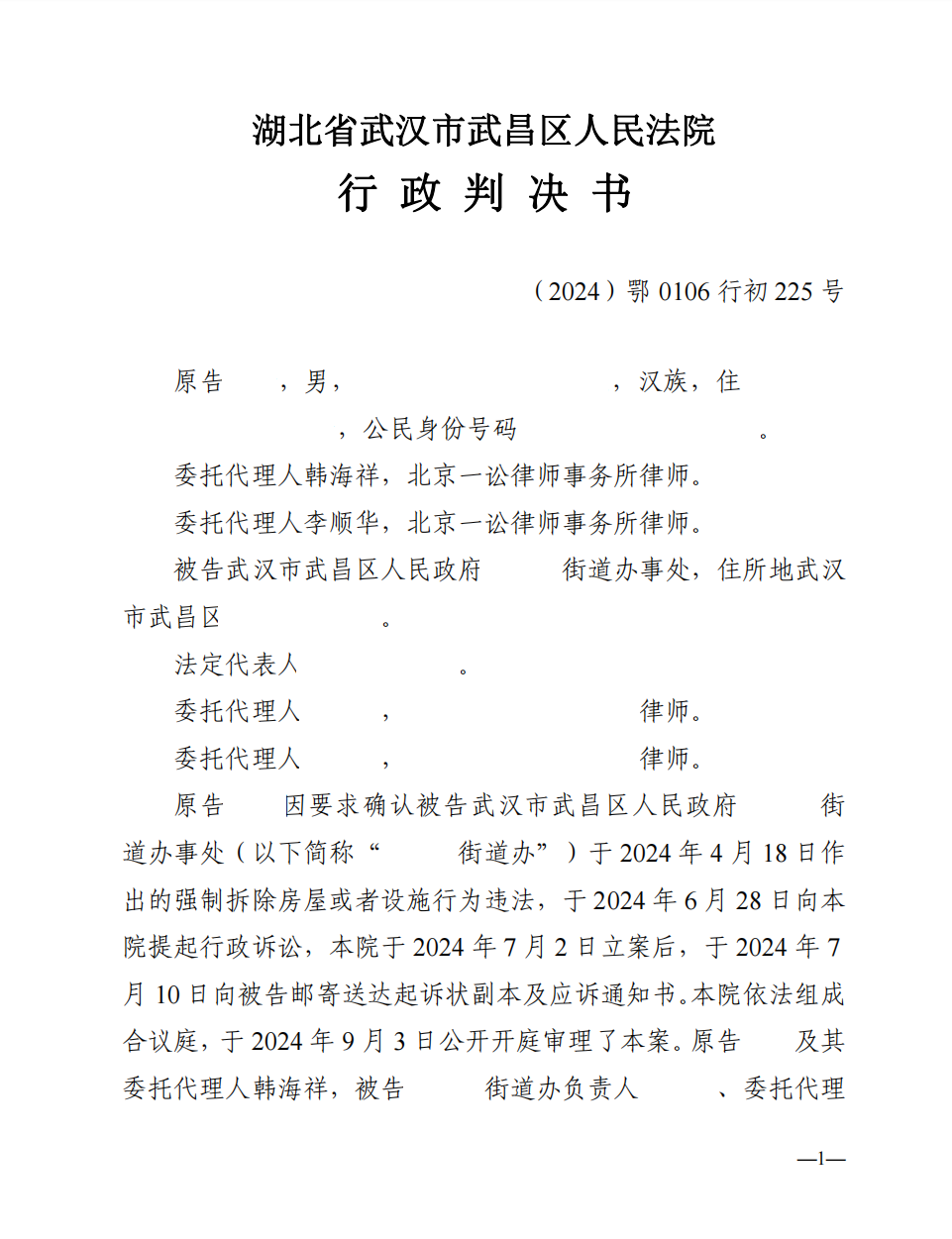 一讼资讯 【胜诉公告】湖北省武汉市张先生、谢先生诉武汉市武昌区人民政府xx街道办事处强制拆除房屋违法一案> 【胜诉公告】湖北省武汉市张先生、谢先生诉武汉市武昌区人民政府xx街道办事处强制拆除房屋违法一案