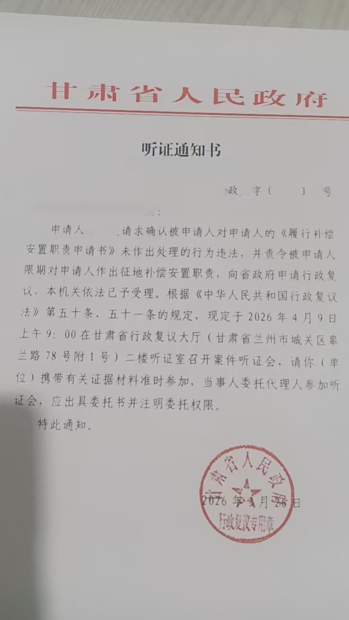甘肃庆阳傅先生、付女士二人复议庆阳市人民政府履行补偿安置职责一案,定于2026年4月9日9时在甘肃省司法厅行政复议大厅二楼听证室召开听证会。(李顺华律师、单瑞泽实习律师代理)