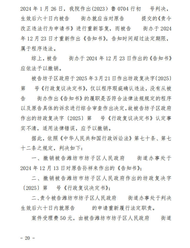 【胜诉公告】山东孙先生诉街道办、区政府不履职及行政复议案