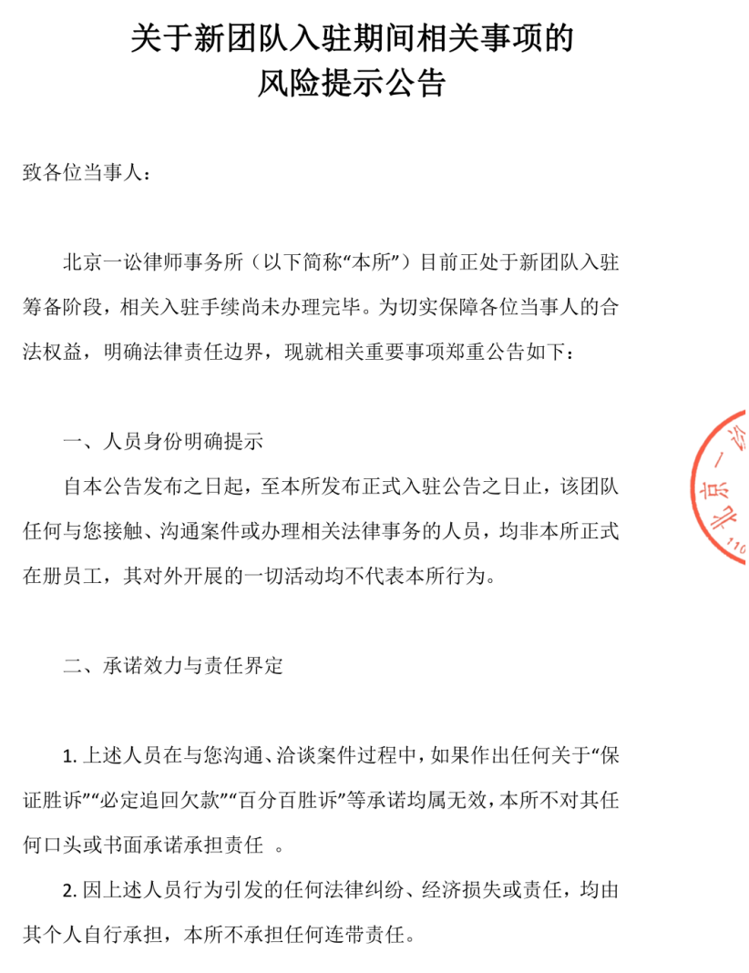 > 关于新团队入驻期间相关事项的风险提示公告