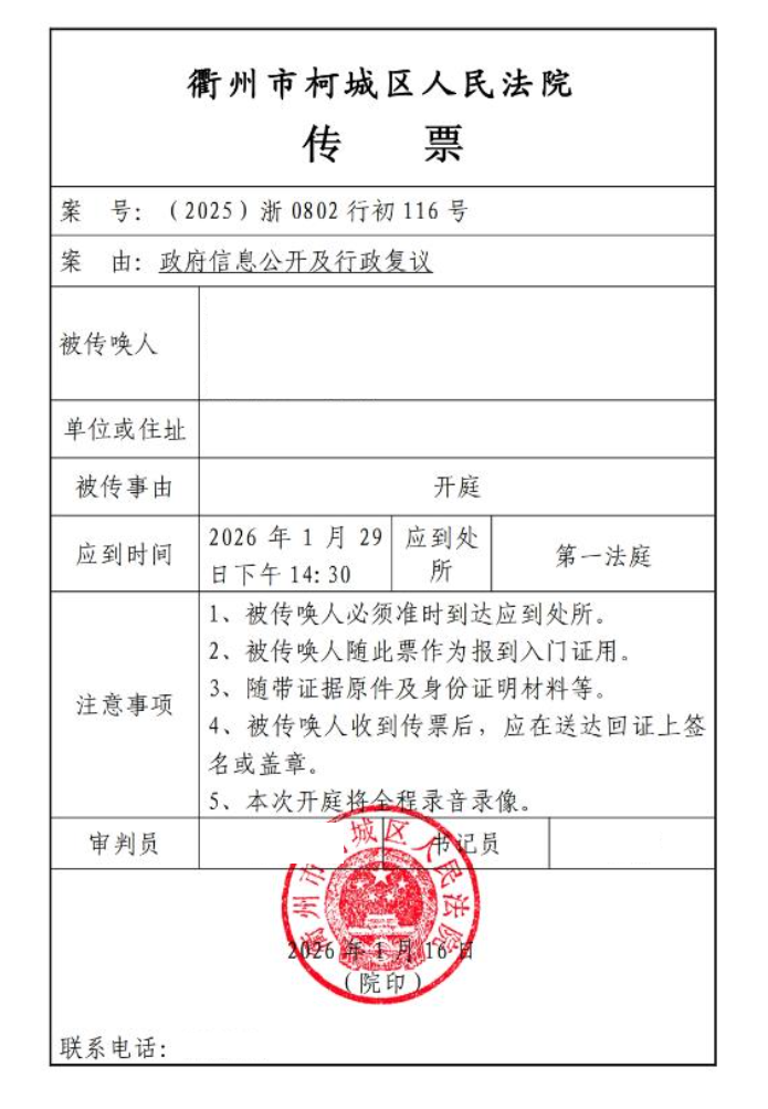 衢州某有限公司衢州某管委会、衢州市人民政府信息公开及行政复议一案,定于2026年1月2914时30分在衢州市柯城区人民法院第一法庭开庭审理。(韩海祥律师代理)