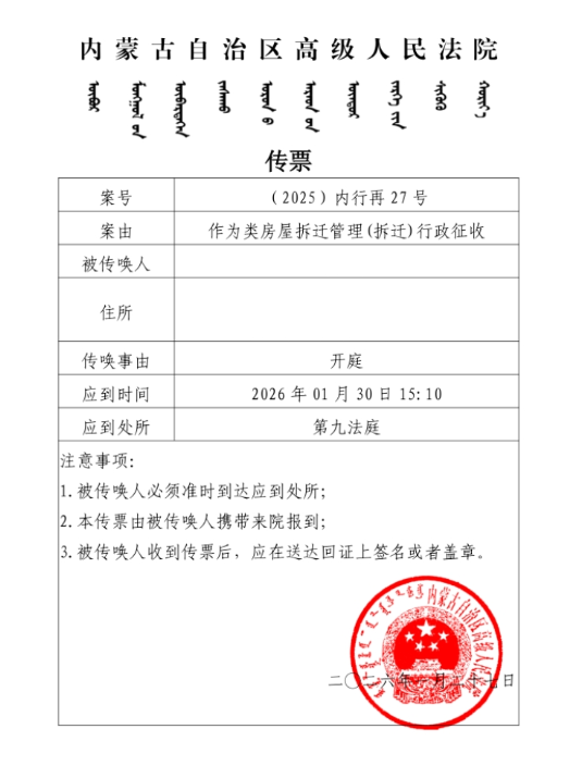内蒙古张先生诉内蒙古鄂尔多斯市某镇征收服务中心行政协议一案,定于2026年1月3015时在内蒙古自治区高级人民法院第九法庭开庭审理。(李顺华律师、韩海祥律师代理)