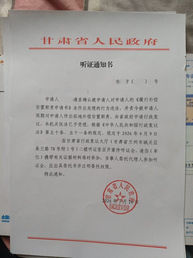 甘肃庆阳傅先生、付女士二人复议庆阳市人民政府履行补偿安置职责一案,定于2026年4月9日9时在甘肃省司法厅行政复议大厅二楼听证室召开听证会。(李顺华律师、单瑞泽实习律师代理)