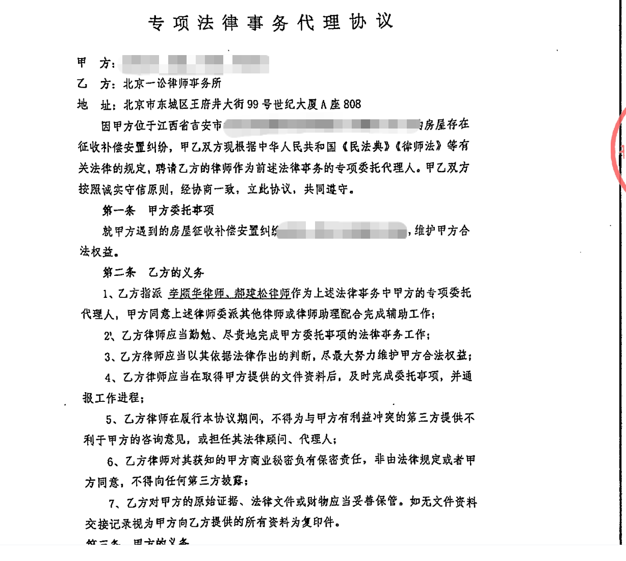 刘先生就江西吉安农村住宅征收拆迁维权事宜,经亲友推荐、深度咨询、律师充分研判维权可行性后,正式委托北京一讼律师事务所李顺华主任、郝建松律师,全权代理本案全部法律事务,特此公告。